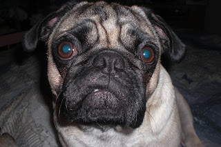 The laser eyes can be scary, but then again how scary can pugs be when resting their heads on chairs! hehe
